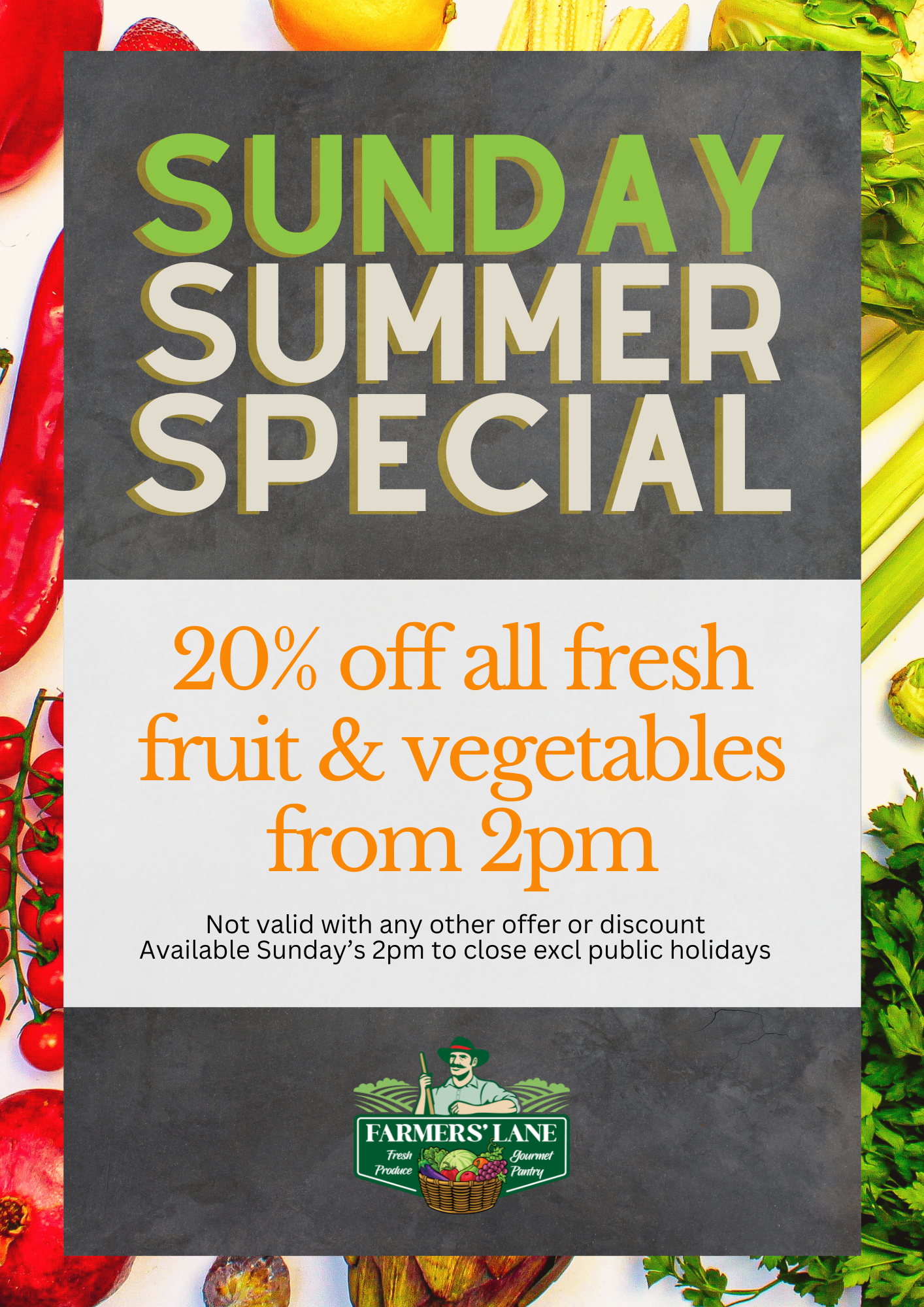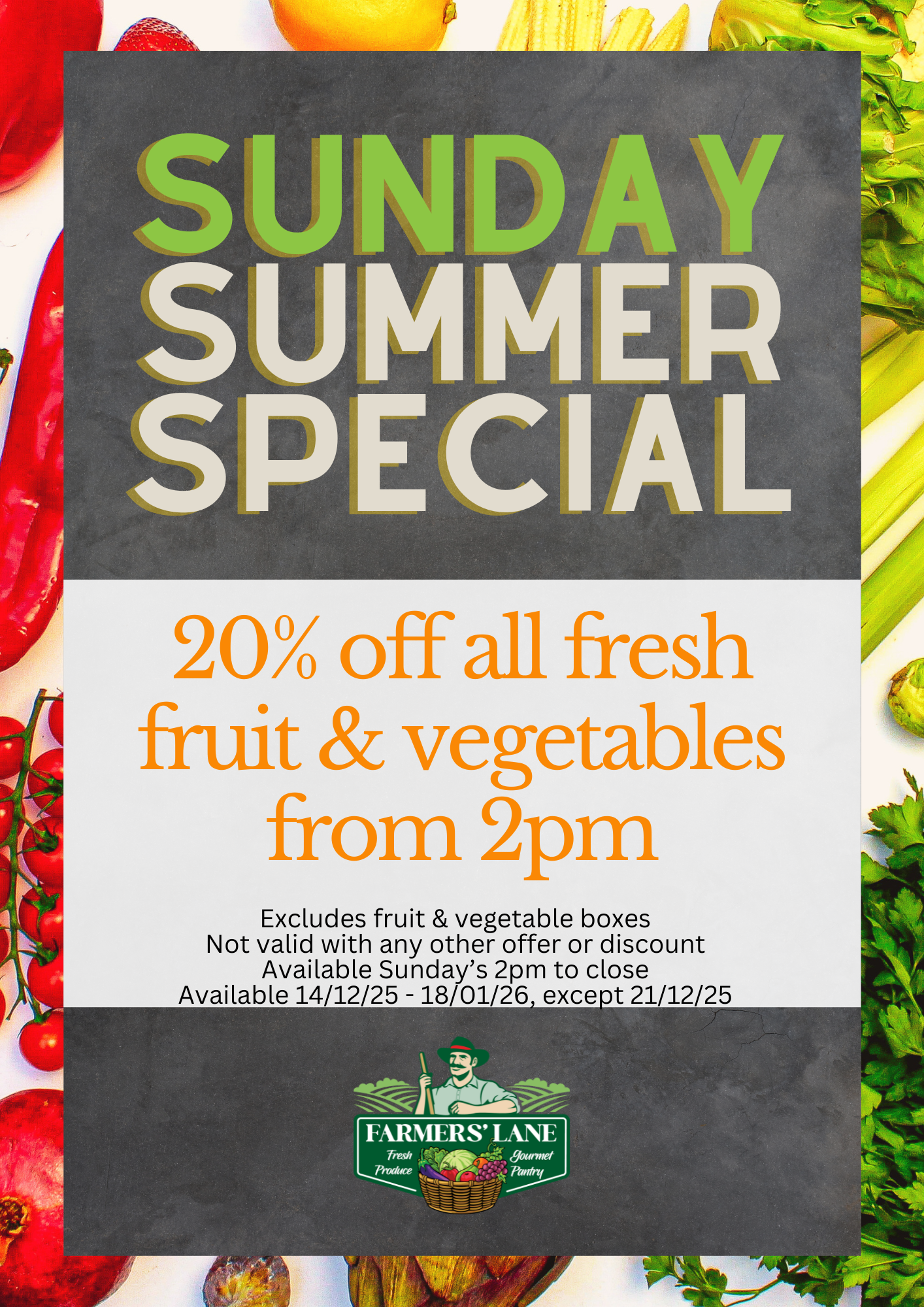 Sundays just got sweeter at Farmers’ Lane! Each week from 2pm to close (6pm), we’re clearing out our end-of-week stock with 20% off all fresh fruit and vegetables. It’s the perfect chance to scoop up your faves for less as we roll into a new week.