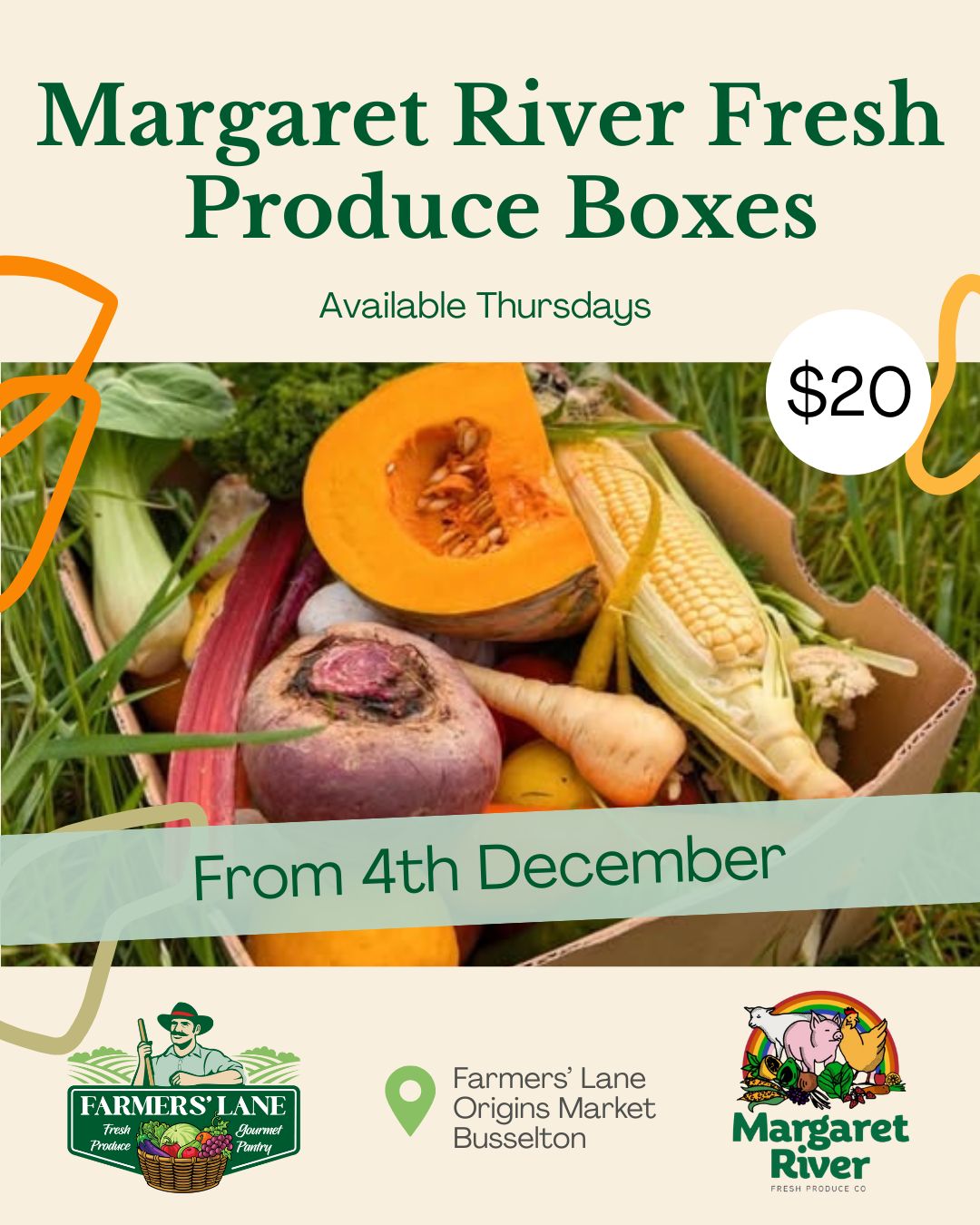 We're excited to offer the much-loved Margaret River Fresh Produce boxes right here at Farmers' Lane. Available from Thursday, until stock lasts, for just $20 each.